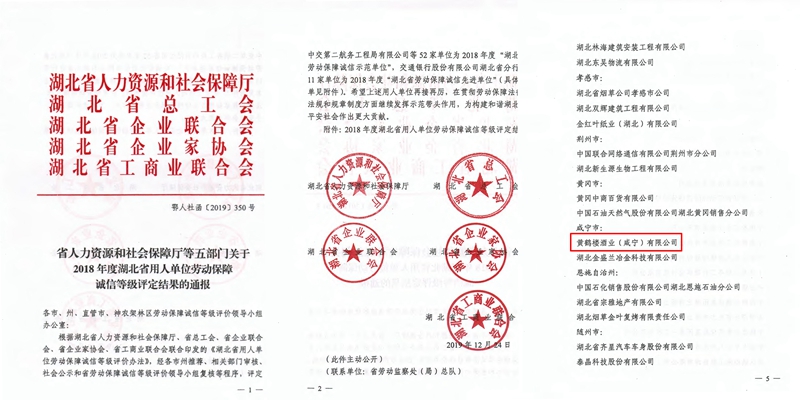 近日,經(jīng)湖北省人力資源和社會(huì)保障廳等五部門評(píng)定,黃鶴樓酒業(yè)(咸寧)有限公司被授予“2018年度湖北省用人單位勞動(dòng)保障誠信示范單位”稱號(hào)。